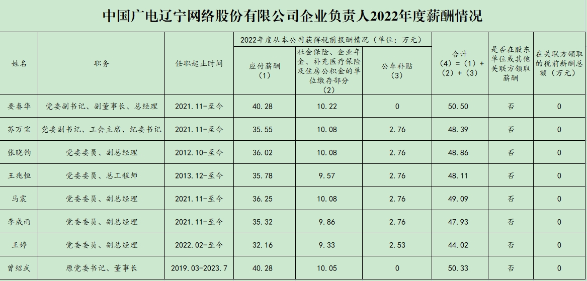 中國廣電遼寧網絡股份有限公司公司董事、監事、高級管理人員2023年度薪酬情況
